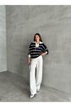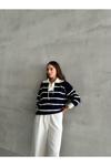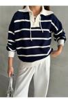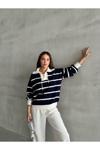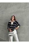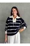 Laluvia Lacivert Mike Polo Yaka Ekru Çizgili Önü Bağcık Triko Kazak-4469