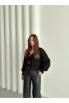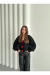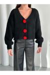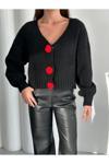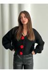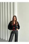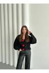 Laluvia Siyah - Kırmızı Çiçek Düğmeli Hırka - 4686