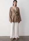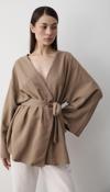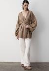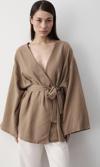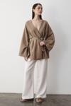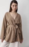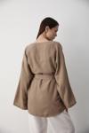 Laluvia Sütlü Kahve Pamuklu Düğme Detaylı Kemerli Keten Kimono