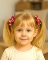 Kız çocuklarının günlük kullanımda ve özel günlerde saçlarına zarif bir dokunuş katacak şık kırmızı üzerine pembe puantiyeli fiyonk saç tokası.