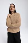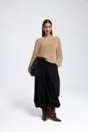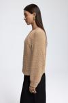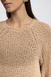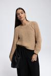 Rahat formda, reglan kollu, kalın örgü, salaş triko kazak.