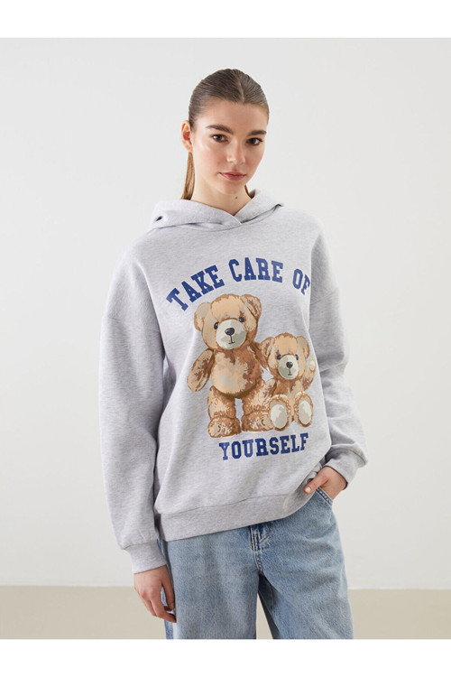 Ürün Kodu:S5M044Z8-E86 - GriAyı ve yazı baskılı kadın hoodie, kulak detaylı kapüşona ve uzun kollara sahiptir.