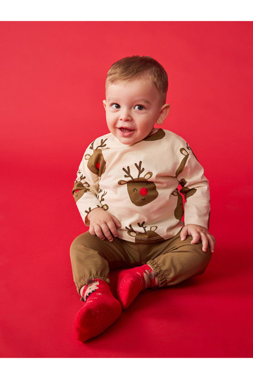 Erkek bebek pijama takımı, bisiklet yaka ve uzun kollu desenli üst ile paçaları lastikli, dizleri yamalı alt parçadan oluşur.