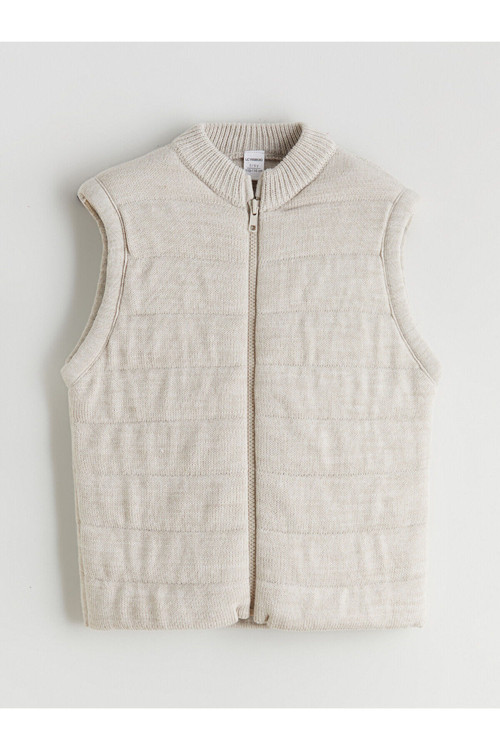 - Dik yakalı ve önden fermuar kapamalı erkek çocuk yelek, triko kumaştan üretilmiştir.