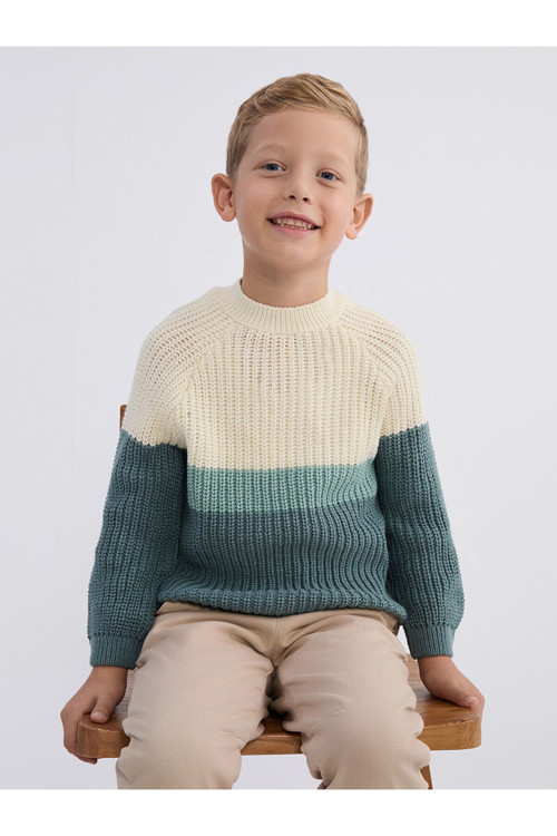 Ürün Kodu:W5CT65Z1-QVK - BejBisiklet yaka ve uzun reglan kollu erkek bebek kazak, renk bloklu tasarıma sahiptir.