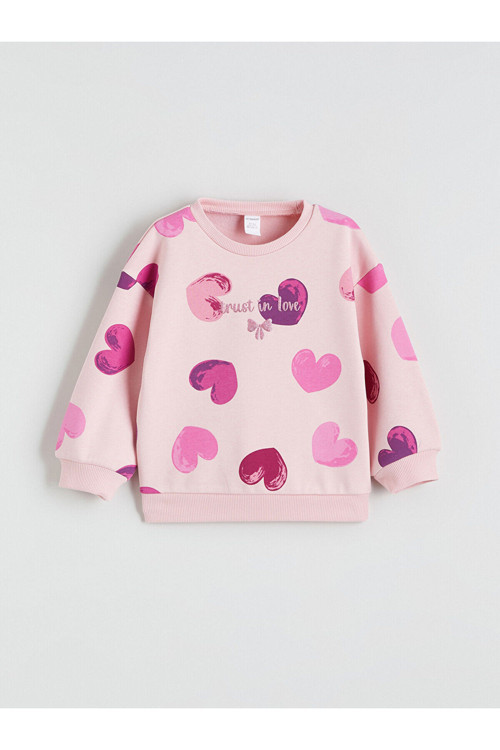 Ürün Kodu:W5NT27Z1-LT4 - PembeBisiklet yakalı ve uzun kollu kız çocuk sweatshirt, kalp desenlidir ve önü yazı baskılıdır.