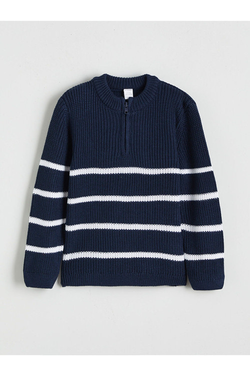 Ürün AçıklamasıYarım fermuar kapamalı dik yakalı erkek çocuk kazak, uzun kollu ve çizgili desenlidir.