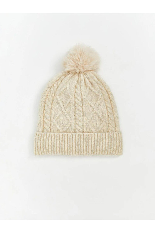 Ponpon detaylı kız bebek bere, triko kumaştan üretilmiştir.