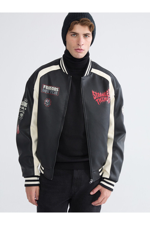 Rahat Kalıp Stranger Things Baskılı Erkek Deri Görünümlü Ceket