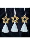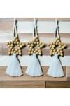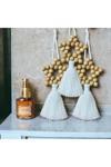 Üçlü set halinde sunulan bu ürün, farklı boyutlardaki püsküller ve boncuklarla göz alıcı bir görünüm sağlıyor