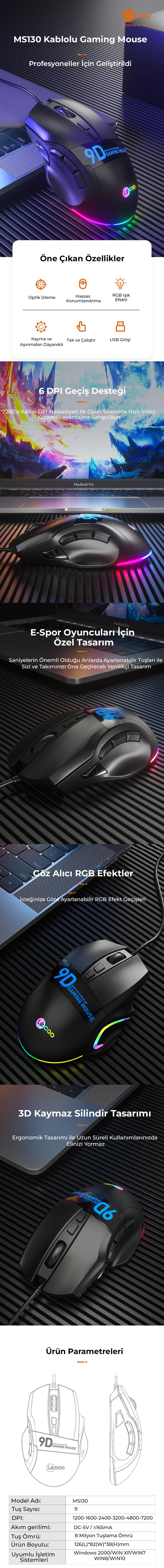 Lecoo MS130 Kablolu RGB Gaming Oyuncu Mouse yumuşak dokunuşlu yapısı ile konforlu, dayanıklı ve hassas bir biçimde dizayn edilmiştir. 9 tuşa sahiptir ve üzerinde bulunan Scroll tuşu, DPI fonksiyon tuşu (1200-1600-2400-3200-4800-7200 DPI) ve ileri-geri fonksiyon tuşları ile size kolay kullanım imkanı tanır. 6 DPI geçiş desteği ve 7200'e kadar DPI hassasiyeti ile oyunun tüm avantajları artık sizin ellerinizde!