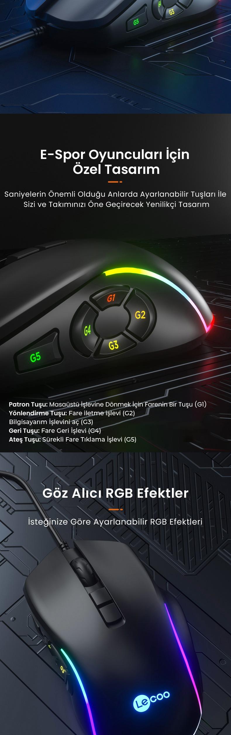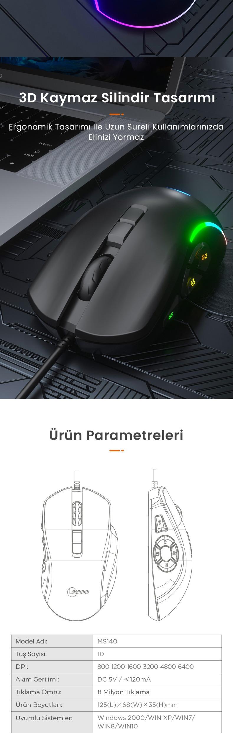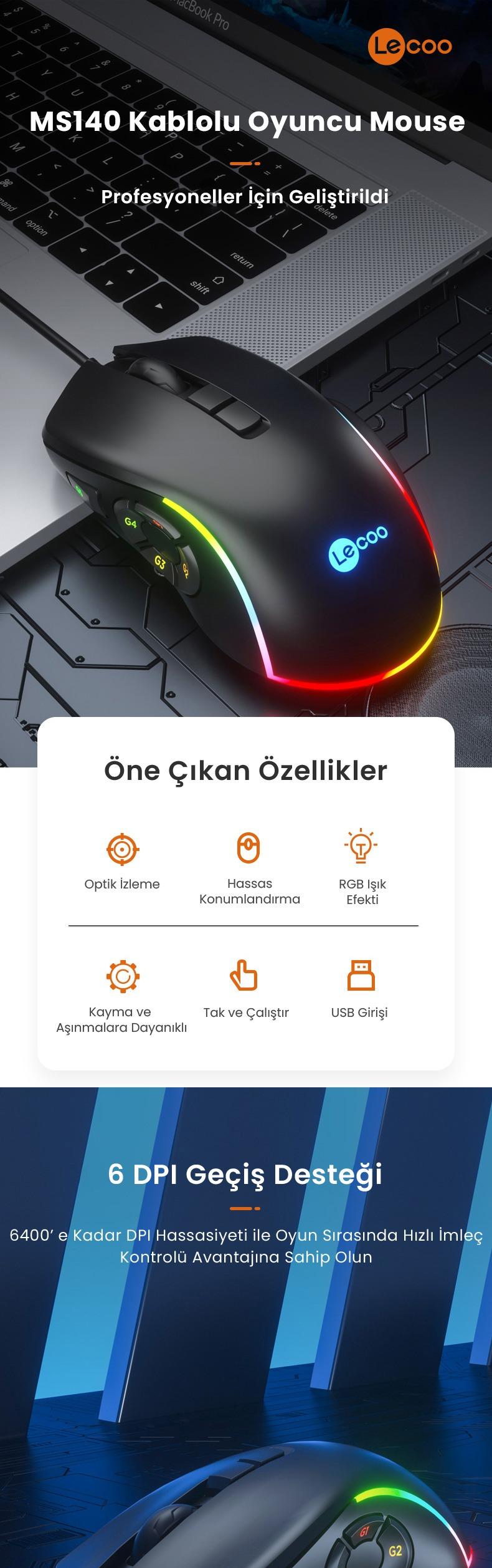 | Paket İçeriği | 1x Lecoo MS140 Kablolu RGB Gaming Oyuncu Mouse 1x Kullanım Kılavuzu |
