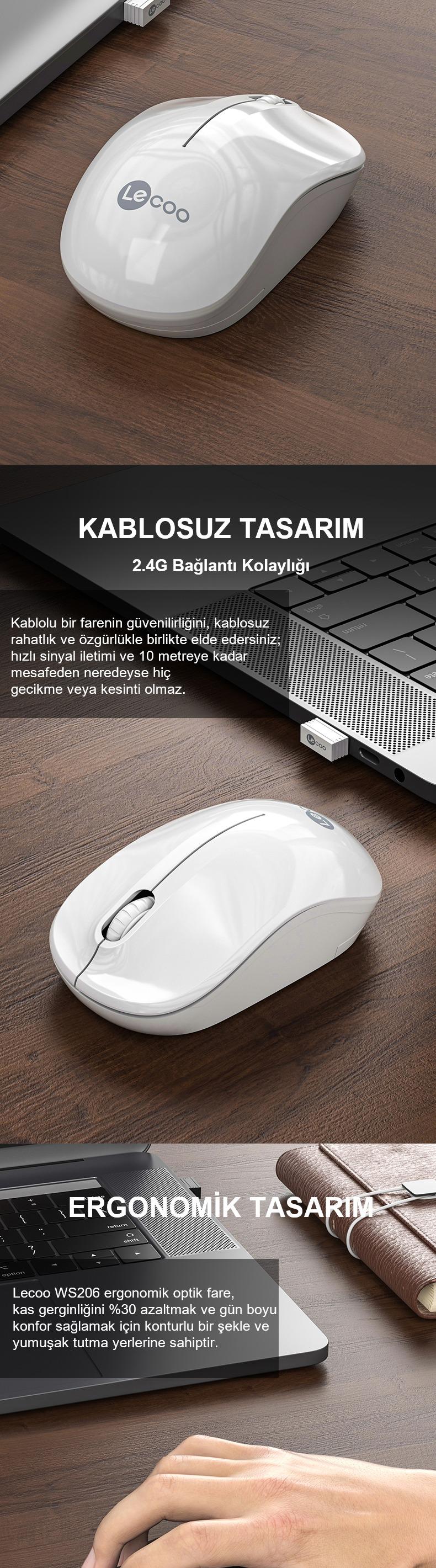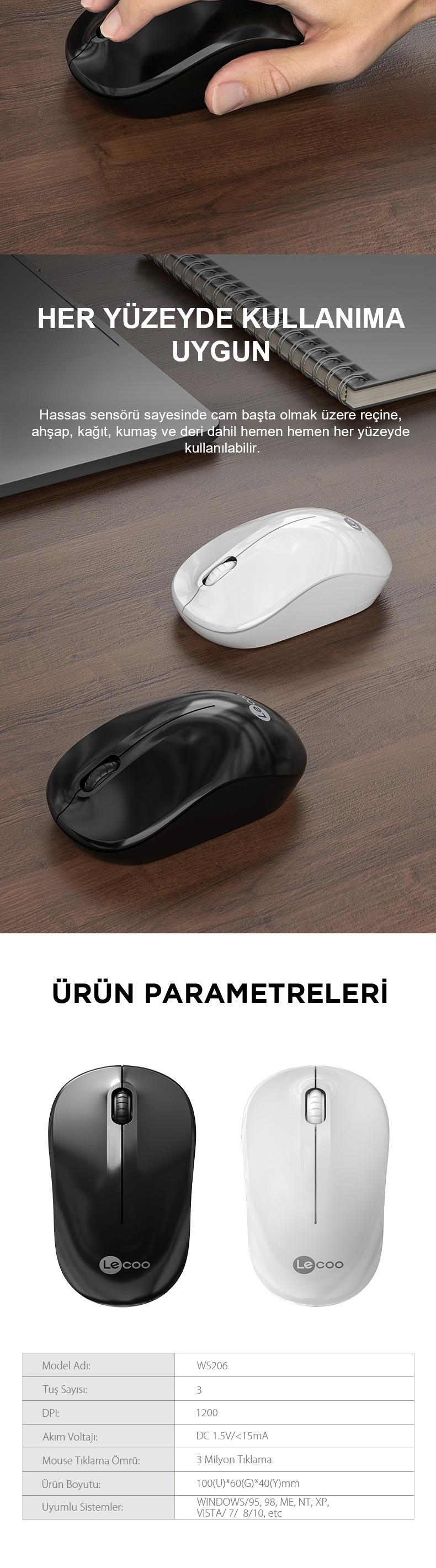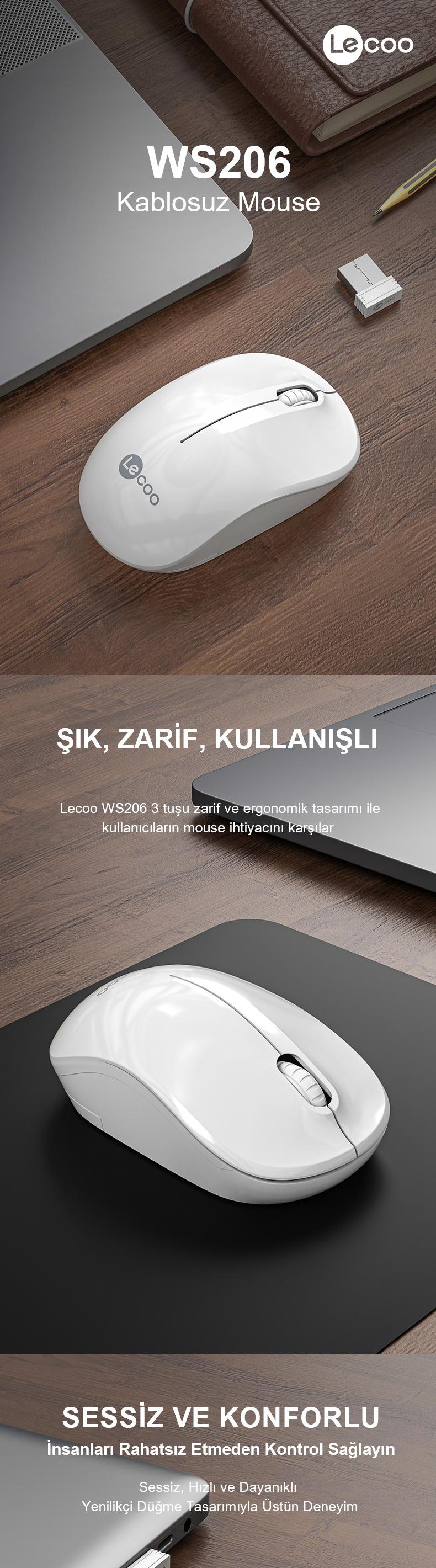 | Kutu İçeriği | 1x Lecoo WS206 Kablosuz Mouse 1x Kullanım Kılavuzu 1x Kablosuz Alıcı 1x AA* Pil |