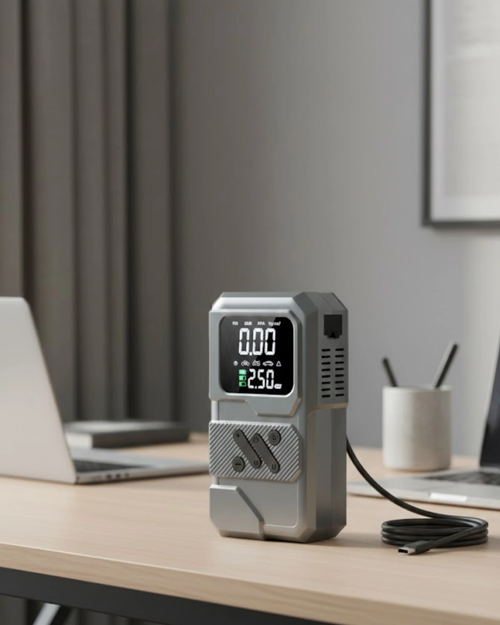 Dijital hava kompresörü, lastik şişirme işlemlerini kontrollü ve pratik hale getirir.