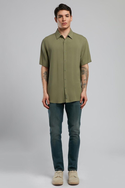 Basices Erkek Kısa Kol Dokuma Gömlek Haki