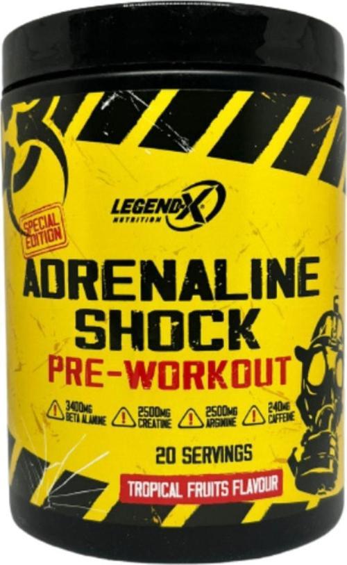 LEGEND-X Adrenaline Shock, özellikle ağırlık, hızlı tempolu kardiyo, koşu, spinning gibi fiziksel güce ve dayanıklılığa dayalı antrenmanlarınıza daha fazla güç katmak için tasarlanmış benzersiz bir pre-workout takviyesidir. Bu ürün, antrenmanlarınızın daha zinde ve tempolu geçmesinde önemli bir rol oynayacaktır. Adrenaline Shock, 240 mg kafein, 3500 mg Beta Alanin, 2500 mg Creatine, 1000 mg Taurin, 2500 mg Arjinin ve 1000 mg Sitrülin gibi etkili bileşenler içerir. Bu bileşenler, antrenman öncesinde daha yüksek bir enerji, dayanıklılık ve konsantrasyon seviyesi sağlamaya yardımcı olur.