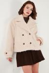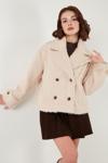 Oversize Kruvaze Yaka Yumuşak Tüylü Düğmeli Astarlı Bayan Mont 6839659 BEJ