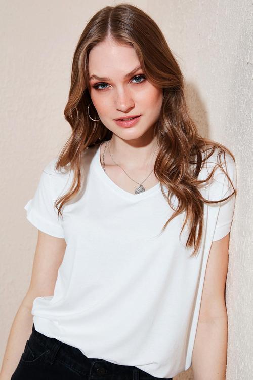 V Yaka Rahat Kesim Bayan Bluz 5862000 EKRU