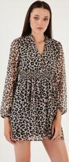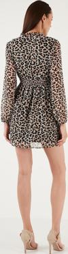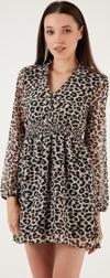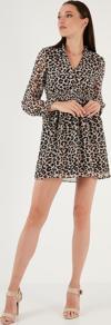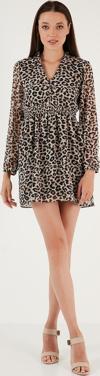 Lela V Yaka Regular Fit Gipeli Düğme Detaylı Şifon Mini Bayan Elbise 611EL01433 LEOPAR