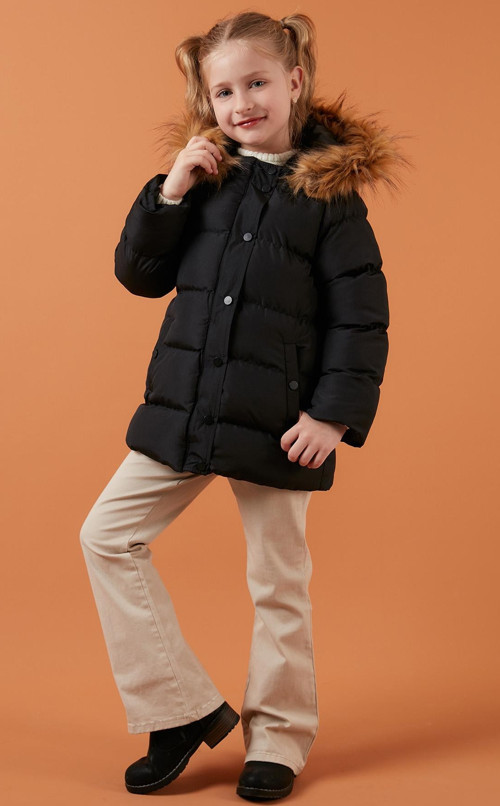 Lela Yakası Suni Kürklü Kapüşonlu Cepli Kız Çocuk Mont 6028720 SİYAH