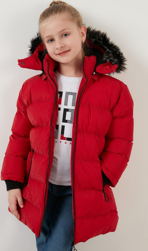 Lela Yakası Suni Kürklü Peluş Astarlı Çıkarılabilir Kapüşonlu Dar Kesim Kışlık Kız Çocuk Mont 5760002 KIRMIZI