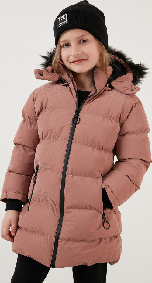 Lela Yakası Suni Kürklü Peluş Astarlı Çıkarılabilir Kapüşonlu Dar Kesim Kışlık Kız Çocuk Mont 5760002 PUDRA