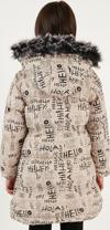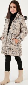 Lela Yakası Suni Kürklü Yazı Baskılı Çıkarılabilir Kapüşonlu Peluş Astarlı Kışlık Kız Çocuk Mont 5761984 BEJ