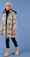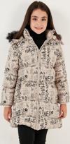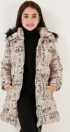 Lela Yakası Suni Kürklü Yazı Baskılı Çıkarılabilir Kapüşonlu Peluş Astarlı Kışlık Kız Çocuk Mont 5761984 BEJ