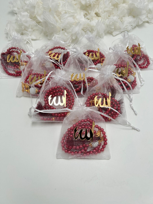 Lena Gift Workshop Bordo Hediyelik Lafızlı Kesede İnci Tesbih ( 10 Adet ) ( Mevlid - Hac - Umre -Bohça)