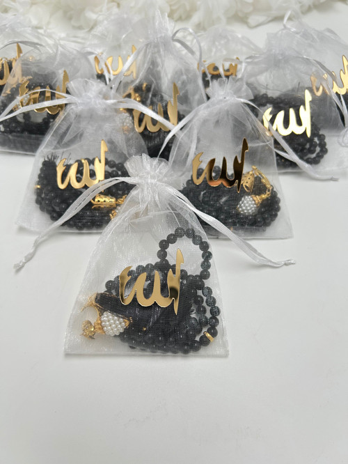 Lena Gift Workshop Siyah Hediyelik Lafızlı Kesede İnci Tesbih ( 10 Adet ) ( Mevlid - Hac - Umre -Bohça)