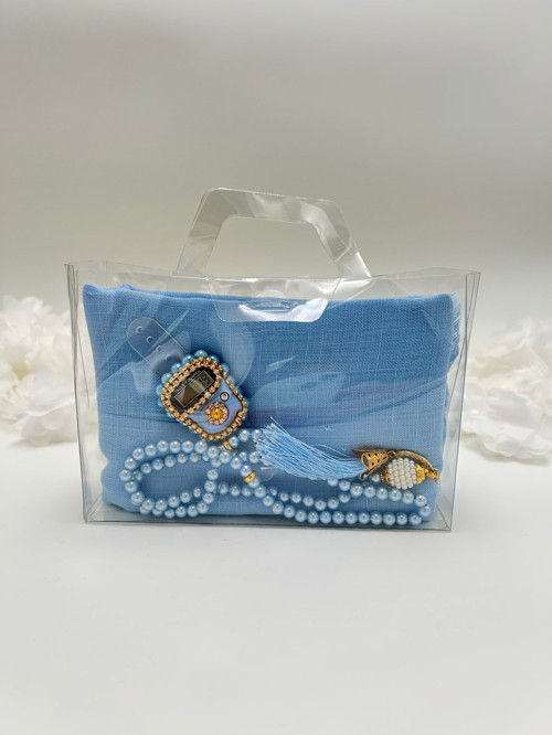 Hediyelik Şeffaf Çantalı Flamlı Örtü, Zikirmatik ve Tesbih Seti ( Hac - Umre - Mevlid - Bohça )