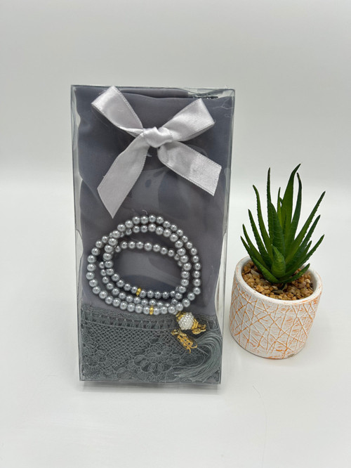 Lenatoptan Gri Çeyizlik, Hediyelik, Bohçalık, Kutulu Namaz Örtüsü Ve İnci Tesbih Seti (Mevlit Sünnet Hac Umre)