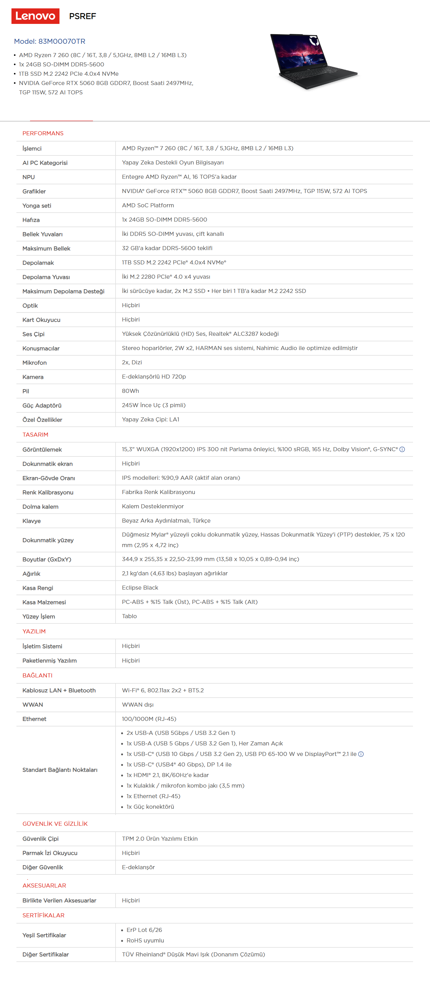Lenovo Legion 5 15AHP10 Amd Ryzen 7 260 24GB 1tb SSD Geforce Rtx 5060 8gb (115W) 15.3" Wuxga IPS Panel 165Hz Freedos Taşınabilir Bilgisayar 83M00070TR