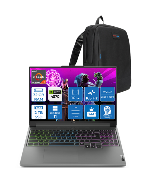 Lenovo Legion Slim 5 Amd Ryzen 7 7435HS 32GB Ddr5 2tb SSD 8gb Geforce Rtx™ 4070 (140W) 16" Wqxga 165Hz Windows 11 Pro Taşınabilir Bilgisayar 883EX001DTRWP06 + Zetta Çanta