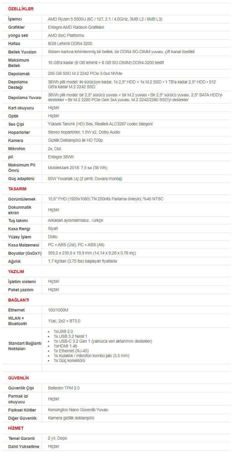 Lenovo V15 Gen2 Amd Ryzen 5 5500U 8gb 256GB SSD 15.6" Freedos Fhd Taşınabilir Bilgisayar 82KD0042TX
