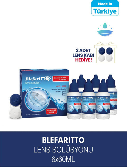 AÇIKLAMA: BLEFARİTTO Lens Solüsyonu; Silikon hidrojel dahil olmak üzere tüm yumuşak kontakt lensler ile kullanım içindir. Lens bakım sistemi, her tip yumusak (hidrofilik) kontakt lens (silikon hidrojeller dahil) lensin, göz doktorunuz tarafından tavsiye edilen sekilde temizlenmesi, dezenfeksiyonu, kayganlaştırması, nötralizasyonu, proteinden arındırılması ve muhafazasında endikedir. LENS SOLÜSYONU Nasıl Kullanılır? 1- Lenslerinize dokunmadan önce ellerinizi iyiceyıkayın, durulayın ve kurulayın. 2- Her bir lensi avucunuzun içine koyun. 3- Üzerine birkaç damla lens solüsyonu damlatın.Lensin her iki tarafını işaret parmağınızla 15-20 saniye boyunca hafifçe ovun.Temizleme işleminden sonra, lenslerinizi çok amaçlı solüsyonla durulayın. 4- Kontakt lens kabınızın kapağını çıkarın ve sollensinizi kabın sol bölmesine, sağ lensinizi ise sağ bölmesine koyun. Lens kabını çok amaçlı solüsyon ile ağzınakadar (hiç boşluk kalmayacak şekilde) doldurun. 5- Kapağını sıkıca kapatın. Lenslerinizi en az 4saat solüsyonun içinde kalmasını sağlayınız. Not: Uzun süre muhafaza edilen lenslerin (örn, 7 gün veyadaha fazla süreyle) tekrar dezenfekte edilmesi önerilmektedir.