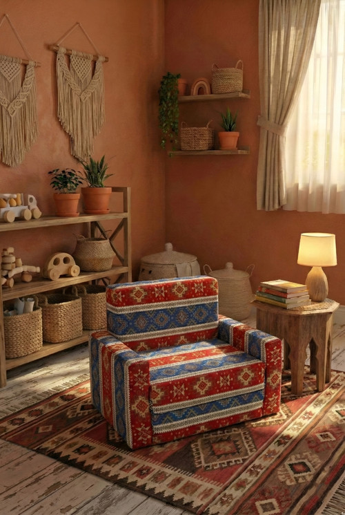 Lensa Home Çocuk Koltuğu Komple Sünger Katlanabilir Yataklı Minder Yatak (0-4 YAŞ) MAVİ KİLİM DESEN