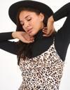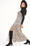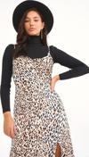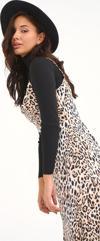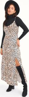 Degaje yaka, ayarlanabilir ip askılı, yan fermuarlı kapama, derin yırtmaçlı, astarsız, uzun leopar desenli saten elbise.