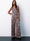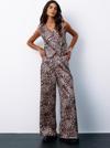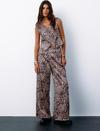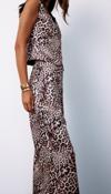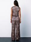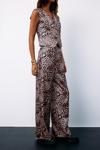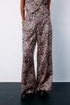 Arkası lastikli bel, yan fermuarlı, geniş paçalı, leopar desenli saten pantolon.