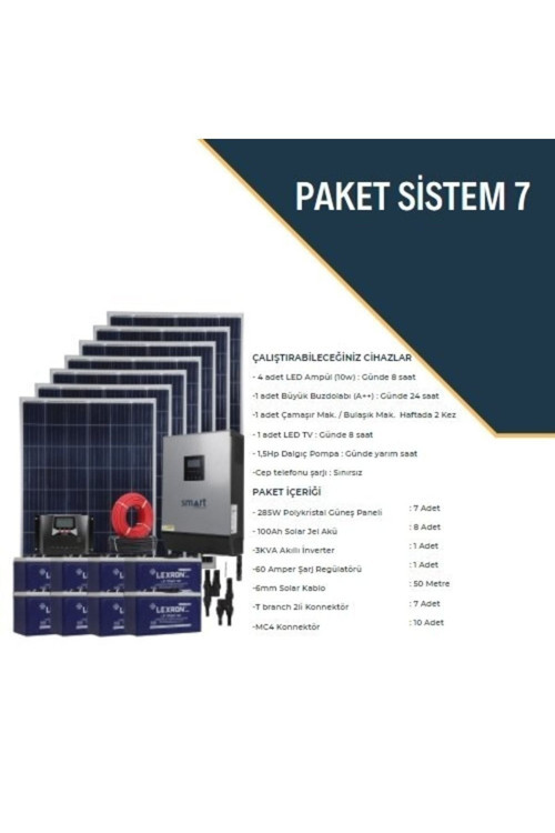 Çalıştırabileceğiniz Cihazlar 4 adet Led Ampül (7W) : Günde 8 saat 1 adet Büyük Buzdolabı : Günde 24 saat 1 adet LED TV : Günde 8 saat 1 adet Uydu Cihazı : Günde 8 saat Çamaşır / Bulaşık Makinası : Haftada 2 kez 1,5Hp Dalgıç Pompa : Günde 1 saat Cep telefonu şarjı : Sınırsız Paket İçeriği: 285W Güneş Paneli : 7 adet 105 Ah Solar Jel Akü : 8 adet 3KVA Akıllı Inverter Mppt Li 50mt Solar Kablo+2 Adet Mc4