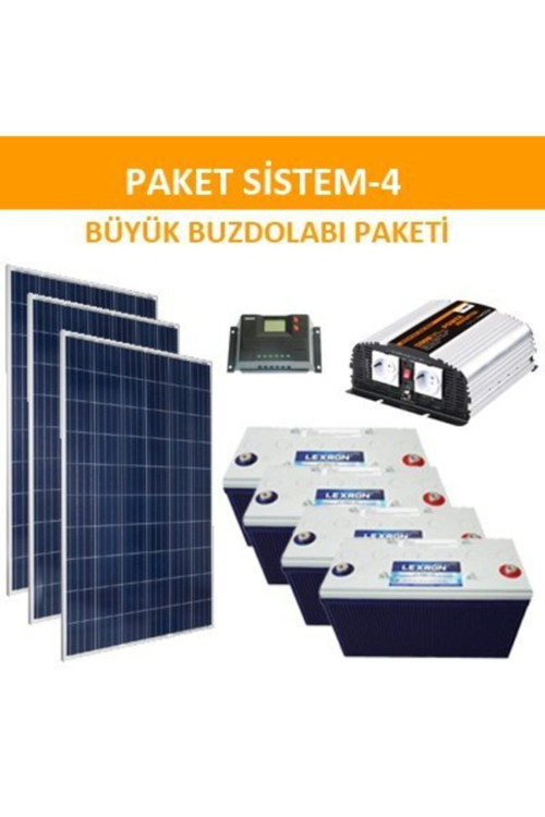 BÜYÜK BUZDOLABI PAKETİ (PAKET 4) Çalıştırabileceğiniz Cihazlar 3 adet Led Ampül (7W) : Günde 8 saat 1 adet Büyük Buzdolabı : Günde 24 saat 1 adet LED TV : Günde 8 saat 1 adet Uydu Cihazı : Günde 8 saat Cep telefonu şarjı : Sınırsız Paket İçeriği: 285W Güneş Paneli : 3 adet 100 Ah Solar Jel Akü : 4 adet 1200W Mod.