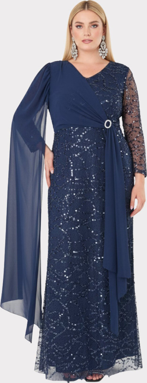 Detay: Büyük beden V yaka pelerin detaylı pul işlemeli uzun abiye elbise, zarif tasarımıyla özel davetlerde şıklığı ön plana çıkarır. Omuzda şifon pelerin, belde sabit toka ve dantel kumaş üzeri pul-payet işlemeleriyle göz alıcı bir görünüm sunarken; transparan kollar modern bir dokunuş katar. Astarlı ve fermuarlı yapısı sayesinde rahat kullanım sağlayan bu yırtmaçsız abiye, elegan tarzı sevenler için ideal bir seçimdir;
