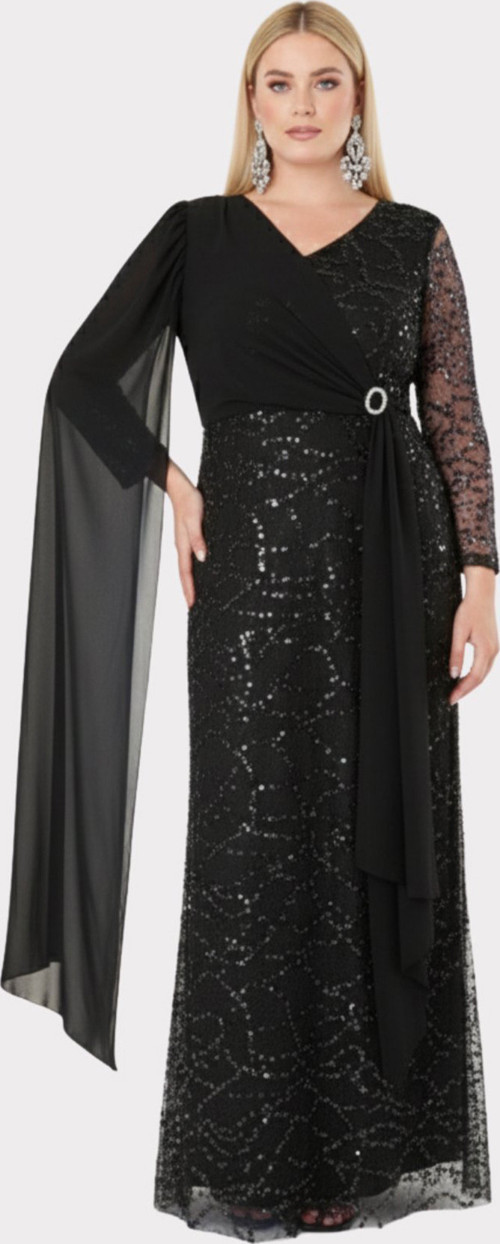 Lilas XXL Kadın Büyük Beden V Yaka Pelerin Detaylı Pul İşlemeli Uzun Abiye Elbise 2521 Siyah