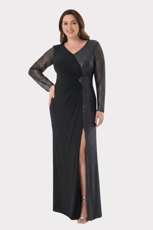 Detay: Büyük beden V yaka taş detaylı uzun abiye elbise, likralı kumaşıyla hem şıklığı hem de rahatlığı bir arada sunar. Uzun kollu ve yırtmaçlı tasarımı, belden drapeli formuyla zarif bir siluet oluştururken; kollar ve bedenin yarısındaki taş işlemeler göz alıcı bir ışıltı katar. Astarlı ve fermuarlı yapısı sayesinde özel davetlerde elegan ve konforlu bir tercih haline gelir;