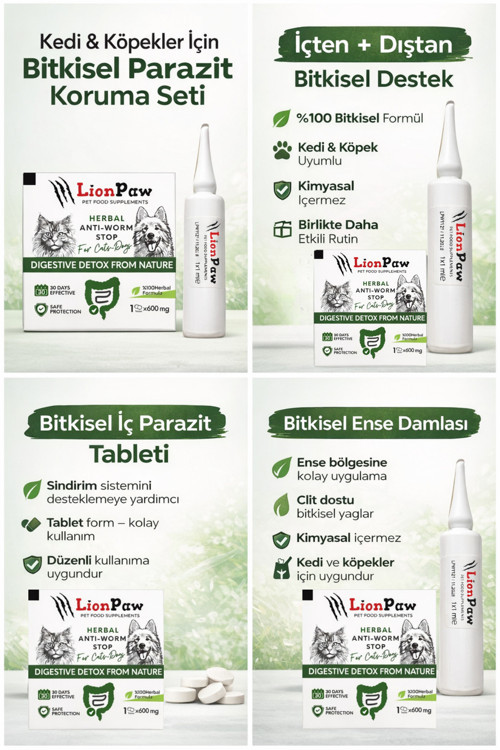 Kedi ve Köpekler için Bitkisel Kedi ve Köpek damlası Tablet kullanımı : 1-10 kg arası 1 tablet 10-20 kg arası 2 tablet 20-40 kg arası 3-4 tablet