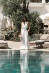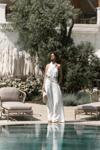 Boyundan bağlı, pencere detaylı, sırt dekolteli rahat keten tulum.