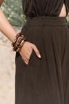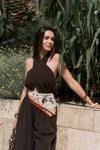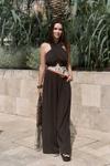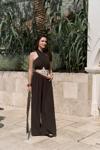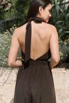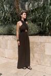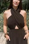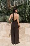 Boyundan bağlı, pencere detaylı, sırt dekolteli rahat keten tulum.
