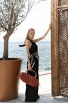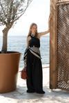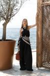 Boyundan bağlı, pencere detaylı, sırt dekolteli rahat keten tulum.