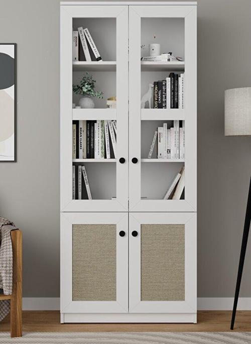 Lisa Kumaş Desenli 4 Kapaklı Beyaz Vitrin - Kitaplık ve Çok Amaçlı Dolap