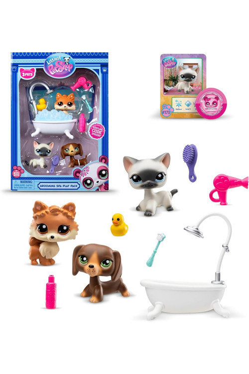 Evcil hayvanlarınızı Littlest Pet Shop Bakım Spa Oyun Paketi ile şımartın! Bu set, her biri kendine özgü bir tarza sahip ve spa'da eğlenceli bir güne hazır 3 sevimli bobblin' evcil hayvanı içerir - #172 Dachshund, #173 Siyam Kedisi ve #174 Pomeranian.